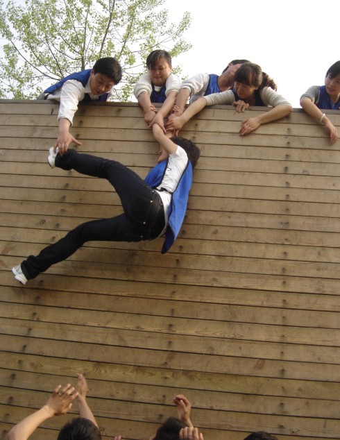 在“畢業(yè)墻”拓展項(xiàng)目拓展訓(xùn)練時(shí),不想說學(xué)到了團(tuán)結(jié)的力量是無窮的,也不想說集體的能力是偉大的,更不想說人的潛能是無限的……這個(gè)拓展游戲給于我們大家的,除了感動(dòng),還是感動(dòng)。為第一個(gè)爬上墻頭,堅(jiān)持救上個(gè)一個(gè)又一個(gè)同伴的朋友感動(dòng)!為在下面咬著牙甘當(dāng)基石,讓一個(gè)個(gè)同伴們踏著自己的肩頭求生的朋友感動(dòng)!為指揮大家伙兒逃生,用自己的雙手將同伴們一個(gè)一個(gè)高高舉起的朋友感動(dòng)!直到墻下只剩下了一個(gè)同伴,再?zèng)]有人給他當(dāng)基石供他向上攀爬的時(shí)候,于是,一個(gè)體重較輕的隊(duì)友從墻頭上垂了下來,墻下的隊(duì)友堅(jiān)定的抓住了墻上同伴的手。當(dāng)最后一人成功躍上墻頭的時(shí)候,響起了經(jīng)久不息的掌聲。感動(dòng)中我們知道我們是一個(gè)整體,我們必須互相幫助互相支持才能完成單個(gè)人根本無法實(shí)現(xiàn)的目標(biāo),在工作中,我們必須把個(gè)人利益服從于公司的利益;我們是一個(gè)整體,是一個(gè)充滿活力不怕困難的整體。