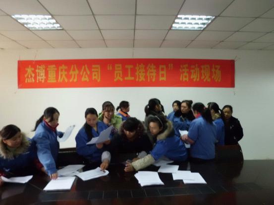 為更好的傾聽(tīng)員工心聲,切實(shí)幫助員工解決工作上存在的困惑、生活上遇到的問(wèn)題,本著“關(guān)心工作、關(guān)心生活、關(guān)心成長(zhǎng)”的杰博服務(wù)文化,“為客戶(hù)服務(wù)的心,永無(wú)止境;為員工服務(wù)的心,永無(wú)止境”的服務(wù)宗旨, 致力于成為中國(guó)人力資源服務(wù)行業(yè)“員工服務(wù)效率”和“員工滿(mǎn)意度”最高的人力資源服務(wù)機(jī)構(gòu)的服務(wù)目標(biāo),2011年12月23日我司聯(lián)合客戶(hù)單位舉辦了杰博重慶分公司“員工接待日”活動(dòng)。