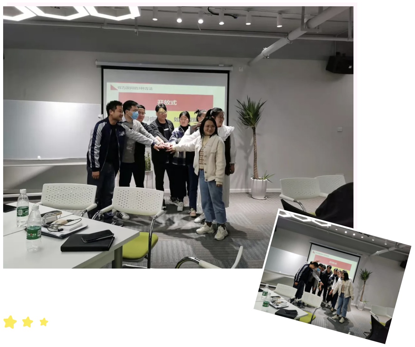 魚缸會議,作為魚的聆聽,作為水的真實事件感召。通過此過程,認清自我,共同提升。從而完成從團伙向團隊的進步,團隊的經(jīng)驗分享,能使隊員經(jīng)驗快速增長,能力成倍增長。